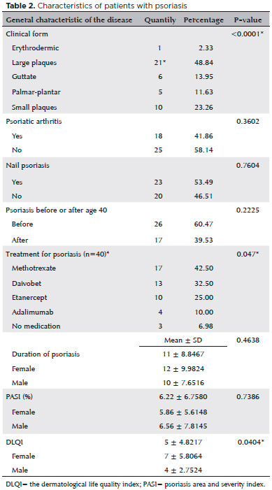 Regarding the clinical forms of psoriasis, large plaques were the most frequent (48.84%) (p<0.05). Additionally, 41.86% had psoriatic arthritis and 53.49% had nail psoriasis. Concerning the age at onset, 60.47% had psoriasis diagnosed before age 40 years, and the mean disease duration was 11 ± 8.84 years. The severity indicators showed a mean PASI of 6.22 ± 6.75 and a mean DLQI of 5 ± 4.82 (Table 2). Most patients were using medication at the time of assessment, with methotrexate used most often, followed by topical Dovobet® (LEO Laboratories LTD/Dublin), etanercept, and adalimumab (Table 2).