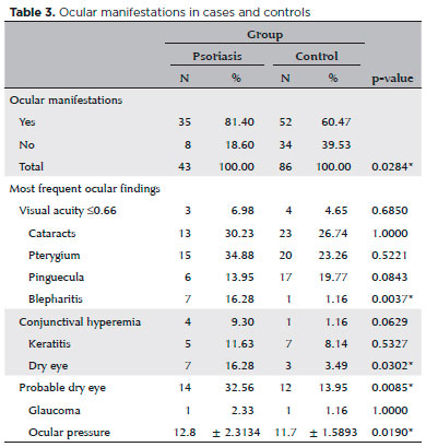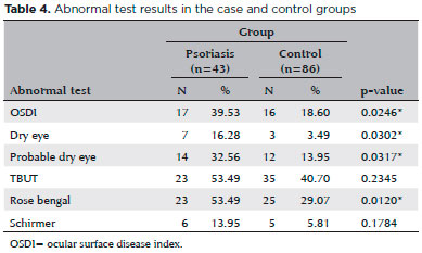 Resultados: Observou-se que nos pacientes com psoríase houve frequência estatisticamente maior de envolvimento ocular, como olho seco (16,28%), provável olho seco (32,56%) e blefarite (16,28%). Além disso, os valores do rosa bengala e do OSDI apresentaram-se mais alterados nos pacientes com psoríase (p<0,05).