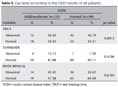 The Schirmer I test was conducted over five minutes, without topical anesthesia, and any measurement less than 10 mm was considered abnormal. The TBUT was performed using 1% fluorescein and was considered abnormal if the mean tear breakup time was less than 10s(8). Concerning the presence of stained corneal lesions, patients were classified according to the presence or absence of superficial keratitis. In the rose bengal test, each eye received a score between zero and nine, and values greater than three were considered abnormal(9). A questionnaire based on the OSDI was administered to assess dry eye symptoms, with the final scores analyzed according to the OSDI interpretation scale(10).