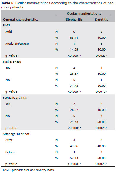 When ocular manifestations were analyzed by the PASI, most patients with blepharitis had a mild PASI (85.71%) (p<0.05), whereas most with keratitis (60%) had a PASI classified as moderate/severe (p<0.05). Furthermore, blepharitis and keratitis were more common when psoriasis began before the age of 40 years (p<0.05) (Table 6). Keratitis was only present in patients with nail involvement (p<0.05). However, ocular manifestations were not related to the presence of psoriatic arthropathy (Table 6).