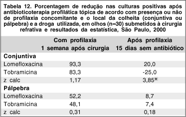 Ainda no estudo da profilaxia na cirurgia refrativa, os indivíduos que receberam tobramicina a porcentagem de redução de culturas positivas da conjuntiva e pálpebra foi de 83,3% e 48,1% respectivamente com 1 semana de pós-operatório (Tabela 11). As comparações das porcentagens de redução de culturas positivas com a utilização dos dois antibióticos estudados nos vários períodos não apresentam diferença significante enquanto o antibiótico tópico estava sendo administrado. Na recuperação da microbiota conjuntival, o grupo que recebeu tobramicina como profilaxia apresenta recuperação significantemente mais rápida da microbiota (Tabela 12).