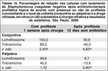 Na análise do comportamento das culturas positivas de Staphylococcus coagulase negativa isolados nos indivíduos submetidos à cirurgia refrativa notamos a semelhança ao comportamento do total de microrganismos isolados. Observamos que o uso da lomefloxacina como profilaxia no grupo da cirurgia refrativa leva a uma porcentagem de culturas positivas menor que o uso da tobramicina tanto na conjuntiva como na pálpebra (Tabelas 13,14 e 15).