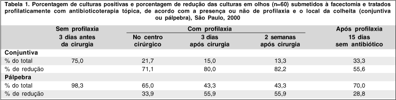 Na análise do grupo submetido à cirurgia de catarata, verificou-se crescimento positivo da microbiota conjuntival em 75% das amostras estudadas de ambos os olhos no período pré-operatório, antes da introdução da profilaxia. As amostras das pálpebras analisadas apresentaram crescimento positivo em 98,3%. O melhor efeito do antibiótico tópico foi observado 2 semanas após a cirurgia, sendo que estes pacientes apresentaram na conjuntiva apenas 13,3% de culturas positivas e na pálpebra 43,3%. Após a interrupção da profilaxia por 15 dias, 1 mês após a cirurgia, notamos que as porcentagens de culturas positivas voltam a aumentar, ficando em 33,3% na conjuntiva e 70% na pálpebra (Tabela 1).