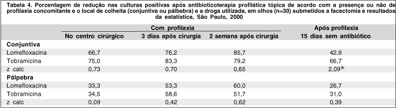 As diferenças apresentadas na positividade das amostras de conjuntiva e nas de pálpebra quando receberam profilaxia foram estatisticamente significantes tanto para a profilaxia com tobramicina quanto com lomefloxacina (Tabelas 2 e 3).
