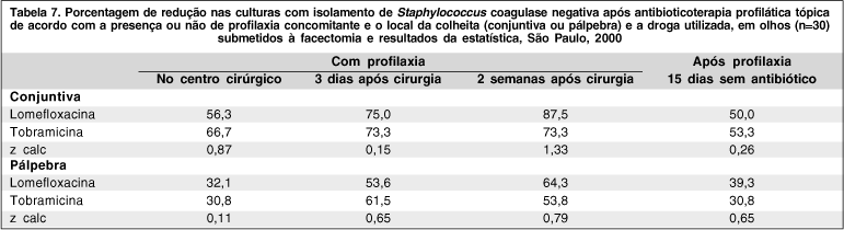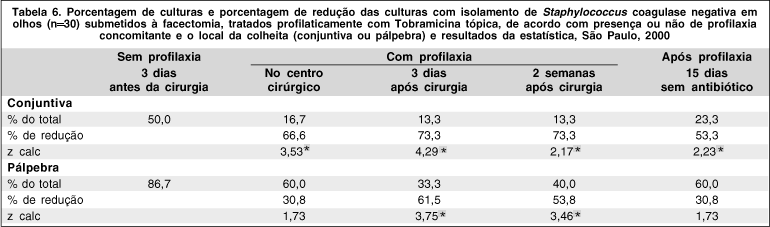 O Staphylococcus coagulase negativa (SCN) foi o microrganismo mais freqüentemente isolado tanto na conjuntiva como na pálpebra. Apenas para esta bactéria, fizemos a mesma análise da porcentagem de redução da profilaxia com o uso dos dois antibióticos e nota-se que os resultados são semelhantes à análise do grupo geral de microrganismos (Tabelas 5, 6 e 7).