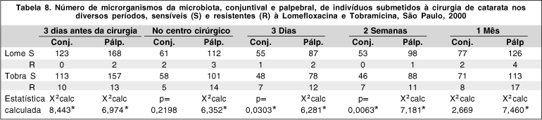 No grupo submetido à cirurgia refrativa também observamos uma maior resistência dos microrganismos à tobramicina. No período pré-operatório na conjuntiva e pálpebra e com uma semana de tratamento a diferença observada na análise da pálpebra permaneceu estatisticamente significante (Tabela 8-A).