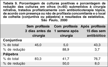 Na avaliação do grupo submetido à cirurgia refrativa verificamos que houve um crescimento positivo da microbiota conjuntival no pré-operatório de 45%, e um crescimento na pálpebra de 83,3%. Com uma semana após a cirurgia, usando o antibiótico profilático, as porcentagens caem para 5% nas culturas conjuntivais e 41,7% nas culturas palpebrais. Podemos notar que no pós-operatório de 1 mês, onde a colheita foi realizada estando os pacientes sem antibiótico profilático há 15 dias, as porcentagens de culturas positivas voltam a aumentar, chegando próximas aos níveis do pré-operatório (Tabela 9).