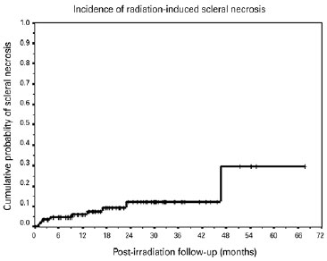 Ocular complications after plaque radiotherapy for posterior uveal melanoma (PUM) have been studied extensively(3-5). These complications include radiation-induced dry eye in 8% of patients, diplopia in 10% of patients, strabismus in 2% of patients, keratitis in 4% to 21% of patients, iris neovascularization in 4% to 23% of patients, neovascular glaucoma in 2% to 45% of patients, cataract in 8% to 68% of patients, vitreous hemorrhage in 4% to 18% of patients, radiation retinopathy in 10% to 63% of patients, radiation maculopathy in 13% to 52% of patients, optic neuropathy in 4% to 46% of patients, and scleral necrosis in 7% to 33% of patients(3,4).