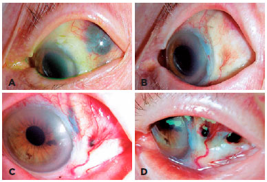 All patients with SNEC had intraocular pressure (IOP) measurements of 18 mmHg or higher, and those needing additional patch grafts had IOP measurements of 20 mmHg or higher (with the use of topical anti-glaucomatous medications). The treatment of patients who developed SNEC varied according to the extent of the scleral defect, visual acuity, and the presence or absence of rubeosis iridis and neovascular glaucoma (Figures 2 and 3). Five patients were treated by implantation of a scleral patch graft (62.5%) and three were treated by observation (37.5%). One of these patients underwent enucleation after two failed patch grafts due to recurrence of SNEC and development of neovascular glaucoma (Figure 3).