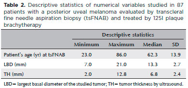 Table 1 summarizes the frequency distributions of the categorical variables studied. The median patient age was 62.3 (± 13.9) years. The median largest basal diameter was 13.3 (± 2.7) mm, and the median tumor thickness was 6.8 (± 2.4) mm. Table 2 summarizes the descriptive statistics of the numerical variables studied.