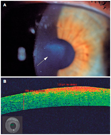 Torricelli et al.(9) stated that normal regeneration of the epithelial basement membrane (EBM) appears to be a critical factor to predict corneal healing with relative transparency or vision-limiting stromal opacity. Structural and functional abnormalities of the regenerated EBM facilitate prolonged entry of epithelium-derived growth factors into the stroma, which stimulate the development of mature myofibrobasts and, therefore, stromal opacity. Therefore, abnormal EBM healing of the corneal apex might have been the cause for the central corneal opacity found in our patient.