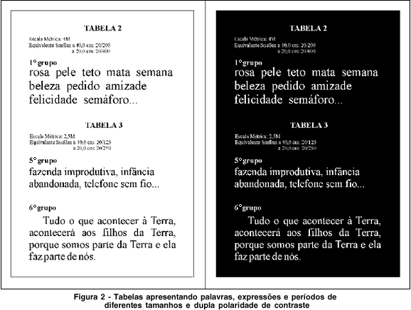 Uma das principais preocupações na elaboração deste novo material foi embasar-se nos princípios lingüísticos da língua portuguesa, o que norteou a seqüência das tabelas impedindo, portanto, a tradução de materiais similares existentes em outras línguas(11). Considerou-se também a magnificação linear, padrão de impressão e a polaridade do contraste. O padrão escolhido foi o Times Roman, por aproximar-se do estilo e da legibilidade dos tipos de impressão mais comumente utilizados em jornais e livros(4).