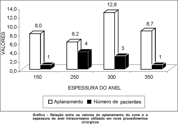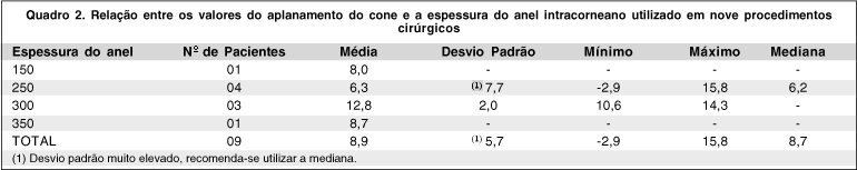 Em razão de a amostra analisada ser muito pequena, pode-se notar que existe uma tendência para que, quanto maior for a espessura do anel implantado, maior será o aplanamento obtido, conforme demonstrado no Gráfico 1. Ressalta-se portanto, que nada pode ser concluído e nenhum teste estatístico pode ser aplicado.