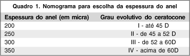 O anel utilizado em todos os pacientes consistia em dois segmentos compostos de PMMA, com espessura variando de 100 a 350 micra dependendo do grau do ceratocone (Quadro 1) e com dois orifícios nas extremidades. Cada segmento possuía comprimento de 150 graus de arco e diâmetro de ápice de cinco milímetros, apresentando uma secção triangular, cuja base era constante para todas as espessuras.