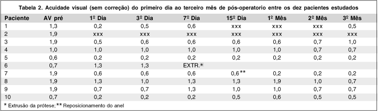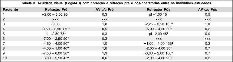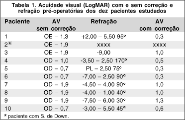 Dos 10 pacientes operados, cinco eram do sexo feminino e cinco do masculino, com idades variando de 15 a 56 anos (média de 27,4 anos), todos pertencentes à raça branca. A acuidade visual pré-operatória com e sem a melhor correção com óculos está mostrada na tabela 1.