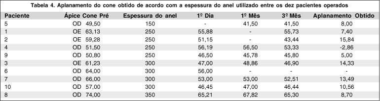 O aplanamento corneano induzido pela cirurgia e evidenciado em nove pacientes através da topografia de córnea, tem sido relatado por outros autores(8-9). Não houve correlação entre a espessura do anel e o aplanamento do ápice do cone. Talvez a falta de precisão no posicionamento e na profundidade dos anéis explique este fato. A acuidade visual melhorou em todos os casos nos quais obteve-se aplanamento do ápice corneano, sendo que dois pacientes atingiram 0,2 unidades LogMAR sem correção e cinco alcançaram 0,5 ou melhor com correção (óculos).