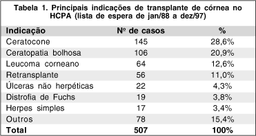 Durante o período analisado, foram incluídos na lista de espera para ceratoplastia penetrante um total de 507 olhos, cujas indicações estão relacionadas na tabela 1. Observa-se que o ceratocone e a ceratopatia bolhosa foram as indicações mais freqüentes.