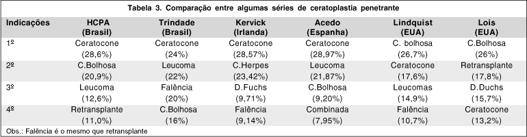Em estudos brasileiros(5-7) a principal indicação de ceratoplastia penetrante é o ceratocone, seguido da ceratopatia bolhosa. Segundo Thomaz(6), a maior incidência de ceratoplastias por ceratocone poderia ser explicada pelos ótimos resultados que se obtém com esse tratamento.