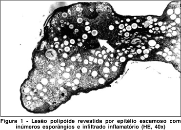 Rinosporidiose é infecção produzida pelo Rhinosporidium seeberi e caracteriza-se por lesões elevadas, lembrando pólipos ou papilomas, com pontilhado branco-amarelado na mucosa(1,2). É mais freqüente na mucosa respiratória da cavidade nasal e menos freqüente no olho, quando é denominada de oculosporidiose, a qual representa cerca de 15% dos casos da doença(3). Mais raramente pode estar presente em outros locais do corpo, já tendo sido descritos acometimentos de vagina, reto, pênis e conduto auditivo externo(4).