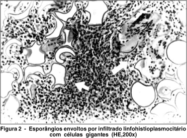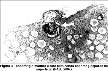 Foi feita a ressecção cirúrgica da lesão, seguida de cauterização da superfície sangrante, sendo a peça enviada para exame anatomopatológico. Ao exame macroscópico, a peça media 7 mm de comprimento e 5 mm de largura, mostrava aspecto polipóide e era constituída por tecido de cor pardacenta, de consistência firme e elástica. O exame histológico das lâminas (coradas por hematoxilina-eosina, PAS, Grocott e tricrômio de Gomori) mostrou estrutura polipóide, revestida externamente de epitélio pavimentoso estratificado, sustentado por tecido conjuntivo, com inúmeros parasitos, processo inflamatório crônico granulomatoso e neoformação conjuntivo-vascular (Figura 1). O infiltrado inflamatório era de forma predominante, constituído por linfócitos, histiócitos e plasmócitos, com presença de polimorfonucleares e alguns eosinófilos, além de células gigantes do tipo corpo estranho (Figura 2). Em meio ao infiltrado inflamatório, foram observadas inúmeras formas fúngicas esféricas ou ovóides, com características morfológicas do Rhinosporidium seeberi, representadas por esporângios maduros, com membrana quitinóide, cheios de esporangiósporos (zoósporos) que por vezes eram cercados por células gigantes do tipo corpo estranho. Em alguns locais, os esporângios penetravam o epitélio e apresentavam-se rotas com eliminação de seu conteúdo através de um poro. Grande número dos esporângios observados mostrava-se atrófico, colapsado ou degenerado (Figura 3). O diagnóstico anatomopatológico foi de rinosporidiose ocular.
