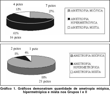Foram incluídos todos os casos com diagnóstico de ametropias em um ou ambos os olhos, sendo estas divididas em miópicas, hipermetrópicas e mistas. As ametropias miópicas incluíram miopia e astigmatismo miópico. As ametropias hipermetrópicas incluíram hipermetropia e astigmatismo hipermetrópico, e as ametropias mistas incluíram somente astigmatismo. Os pacientes com presbiopia associada a miopia ou hipermetropia foram incluídos na respectiva ametropia para longe.