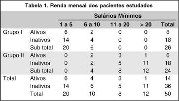 No Grupo I, a maioria dos pacientes havia cursado até o 1º grau. No Grupo II todos os pacientes cursavam ou haviam cursado o 3º grau. Apesar deste contraste cultural, em ambos os grupos houve predomínio de pessoas inativas frente ao mercado de trabalho. Essas pessoas declararam ter renda familiar, habitar casa própria e fazer uso de correção óptica. Esses dados fazem-nos presumir que a maioria dos pacientes analisados eram dependentes econômicamente e compartilhavam renda salarial e domicílio com seus pais, responsáveis ou outros.