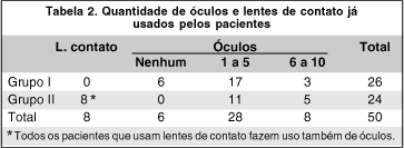 Os pacientes sem uso de correção óptica, totalizaram em 11 (22%) encontrados somente no grupo I, sendo que os motivos pela falta de correção foram dificuldade financeira para aquisição dos óculos em 3 pacientes, não adaptação em 1 paciente e outros como quebra dos óculos em 2, nunca ter consultado oftalmologista em 2 e sem justificativa em 3. Os pacientes que usavam óculos corretores ou lentes de contato na primeira consulta estão demonstrados na tabela 2.