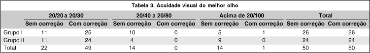 Aferida a acuidade visual com e sem correção no melhor olho dos pacientes, tanto do Grupo I quanto do grupo II, obtivemos a maioria entre 20/20 e 20/30 conforme dados apresentados na tabela 3.