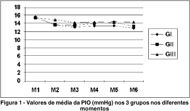 Houve queda da PIO nos 3 grupos ao longo do tempo, que foi estatisticamente significativa (p<0,01) nos grupos em que foi administrado captopril e propranolol, sem diferença entre estes (Tabela 1 e Figura 1).