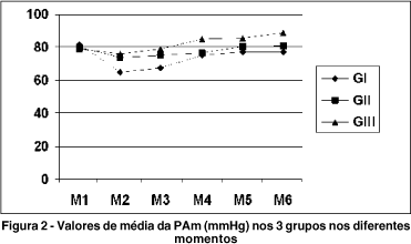Os atributos (PIO, PAm, PP e FC) foram estudados em 6 momentos: 0, 10, 30, 60, 90 e 120 minutos, denominados M1, M2, M3, M4, M5 e M6, respectivamente.
