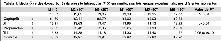 Neste trabalho, o captopril administrado na dose de 1,5 mg/kg por via endovenosa levou à queda de 2,80 mmHg da PIO, correspondente a 17,1%, comparando-se o momento inicial (0 min) e aos 120 min, quando a PIO atingiu seu nível mais baixo. No grupo II (propranolol) houve queda de 2,09 mmHg, correspondente a 13,6%, comparando-se os momentos inicial e aos 120 min, quando a PIO atingiu seu nível mais baixo. Essa queda foi estatisticamente significativa em ambos os grupos. No grupo controle (GIII) também houve queda da PIO de 7,2%, mas que não foi estatisticamente significativa.