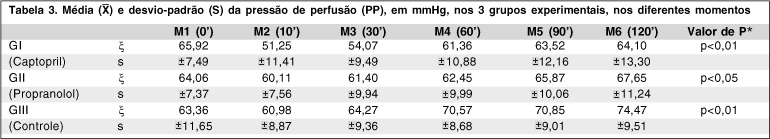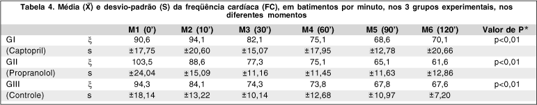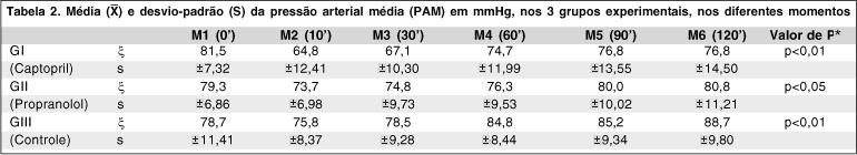 Houve queda estatisticamente significativa (p<0,01) da PP no grupo em que foi administrado captopril (GI) em M2 (10') e M3 (30'), com retorno ao valor inicial a partir de M4 (60'). No grupo em que foi administrado propranolol (GII) e no grupo controle (GIII), não houve queda da PP (Tabela 3).