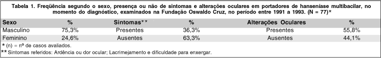 O estudo foi realizado no Centro de Referência Nacional em Hanseníase do Instituto Oswaldo Cruz e no Centro de Referência em Infecção Oftalmológica do Hospital Evandro Chagas, ambos da Fundação Oswaldo Cruz (Rio de Janeiro). A rotina da Unidade Assistencial aos hansenianos inclui, entre outros, o exame oftalmológico no momento do diagnóstico. Foram selecionados 77 casos, classificados como multibacilares e que não tinham sido submetidos a nenhum tratamento específico prévio. O exame oftalmológico foi realizado no período entre 1991 a 1993 por médico oftalmologista utilizando a padronização do exame clínico sugerido pela OMS 8.