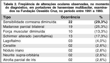 A hanseníase, doença infecciosa causada pelo Mycobacterium leprae, afeta a pele, nervos periféricos e olhos, além de outras estruturas. O envolvimento ocular como causa de incapacidade nesta afecção é bem conhecido. Hansen, em 1873, já referia que "não há doença que tão freqüentemente dá origens a lesões oculares como a lepra". O bacilo pode atingir, direta ou indiretamente, quase todas as estruturas do olho sendo o aparelho lacrimal, pálpebras, córnea e úvea os mais acometidos 1. Referências sobre as complicações oculares da doença em nosso meio foram bem documentadas desde a década de 40 2, 3. Publicações atuais, como a constatação de uveíte com identificação do bacilo na câmara anterior do olho, em paciente com hanseníase multibacilar 4 e pesquisas do M. leprae na conjuntiva 5 e na retina 6 fornecem informações importantes para um melhor entendimento do olho e seus anexos na infecção hansênica. O objetivo deste trabalho foi determinar a freqüência e as alterações oculares mais encontradas em portadores de hanseníase classificados como multibacilares 7 no momento do diagnóstico.