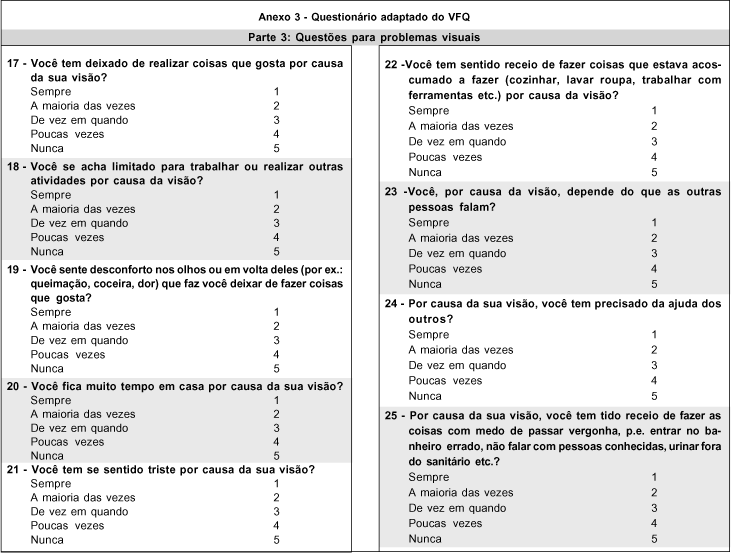 Existem diversos instrumentos para avaliar qualidade de vida cuja validade e confiabilidade já foram demonstrados em populações diferentes(5). A maioria desses instrumentos são aplicáveis apenas àquela cultura para a qual foram desenvolvidos(6). A adaptação de questionários utilizados para pacientes com distúrbios visuais permite não somente a exploração dos impactos específicos da baixa de visão, mas também, comparar diferentes terapêuticas em relação ao risco-benefício(6).
