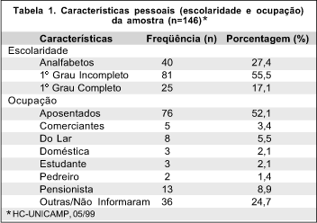 Foram entrevistados 146 pacientes durante o período estabelecido. A idade média foi de 63,36 ± 15,78 anos (variando de 11 a 91 anos), sendo 47,3% do sexo masculino e 52,7% do sexo feminino. Entre os 146 pacientes, 27,4% referiam ser analfabetos, 55,5% referiam ter cursado o primeiro grau incompleto, e 17,1% haviam completado o primeiro grau. Apenas 16,4% exerciam atividade profissional. Os demais entrevistados (83,6%) eram, em sua maioria, aposentados (52,1%) (Tabela 1).