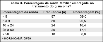 O gasto médio mensal com a medicação antiglaucomatosa foi de 36,1± 32,0 reais (variando de 2,1 a 131,9 reais), o que correspondeu, em média a 19,4% da renda individual (variação de 0,4 a 98,1%) e 15,5% da renda familiar (variação de 0,4 a 77,9%). Aproximadamente 24,0% dos entrevistados tiveram 25% ou mais de sua renda familiar comprometida com o custeio do tratamento antiglaucomatoso (Tabela 3). Os colírios recebidos pelos pacientes na forma de doação não foram utilizados para esse cálculo, por se tratar de uma atitude dependente de uma série de variáveis.
