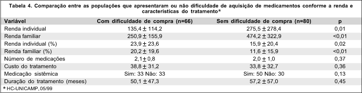 A renda familiar média dos pacientes envolvidos neste estudo correspondeu a pouco menos de 3 vezes o salário mínimo vigente na época. A prevalência de falha no uso da medicação por motivos econômicos foi elevada (45,2%), e aparentemente está relacionada à baixa renda familiar e a elevada porcentagem desta empregada na compra das medicações (em média 15,5%).