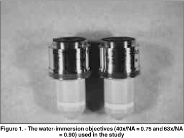 The enucleated rabbit eyes kept in place with a pneumatic support gave no blurred images during the examination with either objective. Because of this, the best performances of both objectives were well documented with no disturbance due to eye movements. We also found that higher illumination levels (approximately 100%) were needed to obtain the better images of the intermediate cell layer with the 63x/NA = 0.9 objective. It may be due to the reflectivity of these cells which present a low-contrast object for confocal microscopy. However, this stronger light would certainly disturb patients, as recorded by Prydal et al. 1 in studies on the cornea and tear film by confocal microscopy.