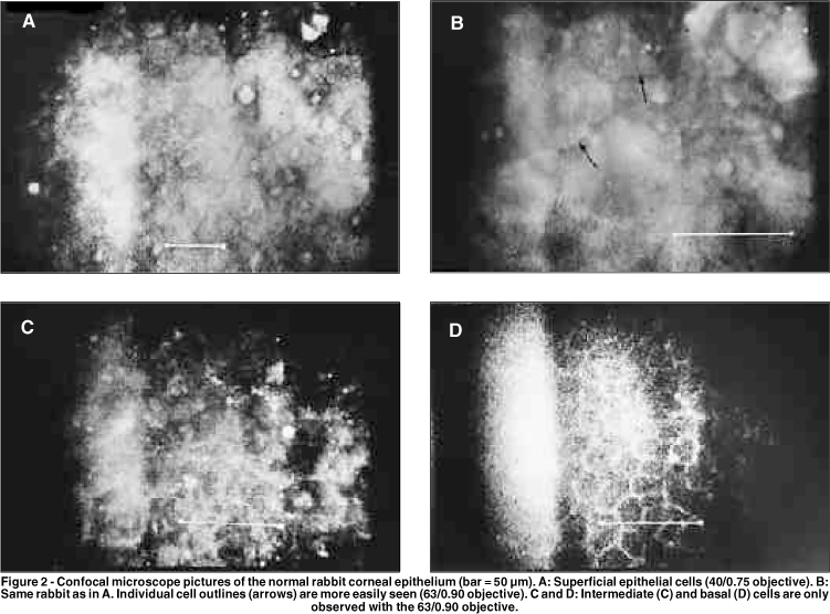 Slit-lamp examination in rabbit and human corneal epithelium showed no alteration. The follow descriptions summarize the confocal microscopic findings and the objectives used are shown in figure 1. In viewing confocal images, it is important to remember that the optical sections are taken through the front. We consider that the width on the 40x/NA = 0.75 objective is about 320 µm and about 200 µm on the 63x/NA = 0.9 objective.