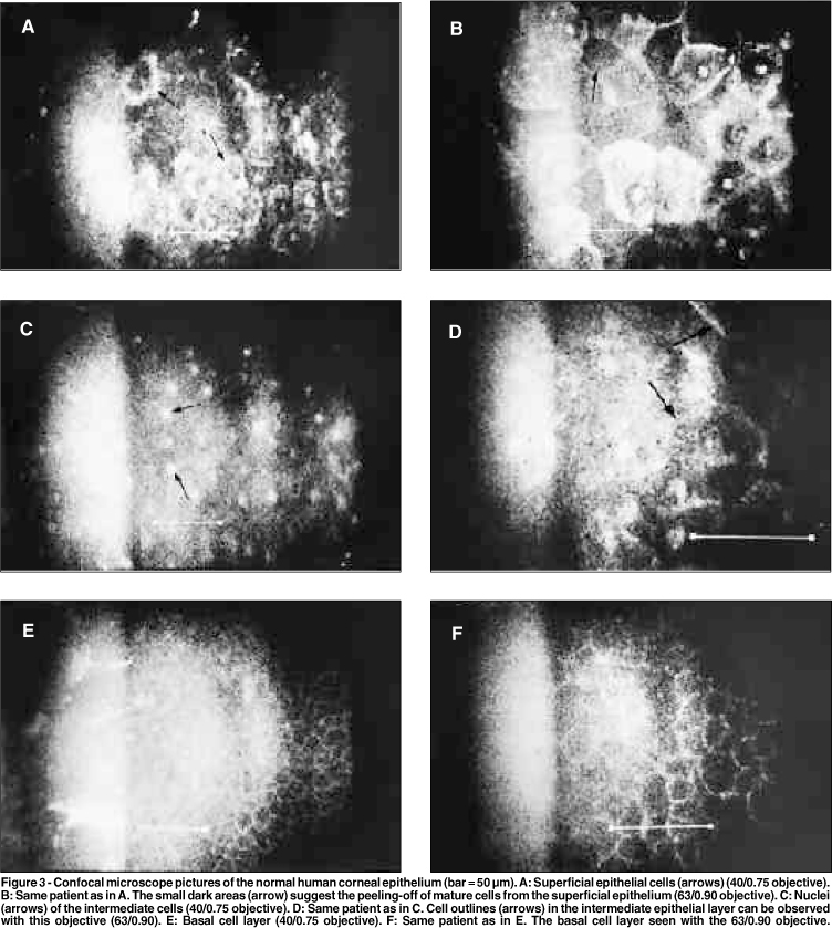 The majority of the studies on the corneal epithelium have generally been done with standard objectives. Cavanagh et al. 7 have described the appearance of normal superficial epithelium under the confocal microscope using a 20x/NA = 0.38 objective. Ichijima et al. 21 observed the deleterious effects of prolonged wearing of rigid gas permeable contact lenses on superficial corneal epithelia of rabbit eyes with a 24x/NA = 0.6 objective. Our first study on the corneal epithelium assessed cystic disorders using the 40x/NA = 0.75 objective 5. However, we believe that standard objectives showed only the more superficial lesions of the epithelium.