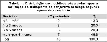 A taxa de recorrência foi de 41,6% (15 casos), com intervalo de tempo entre o transplante de conjuntiva e a recidiva variando de 1 até mais do que 6 meses (Tabela 1).