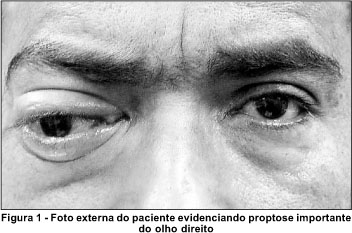 Paciente de 43 anos, sexo masculino, branco, procurou atendimento no Pronto Socorro do Hospital de Clínicas de São Paulo referindo que há cerca de 3 meses sentia a protrusão do olho direito (OD) quando realizava atividades que exigiam esforço e que há 3 semanas acordara com dor, hiperemia e proptose do OD e também diplopia vertical em quase todas as posições do olhar. Negava quaisquer antecedentes sistêmicos, traumáticos ou doenças orbitárias prévias. Os antecedentes pessoais e familiares nada revelaram.
