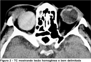Avaliação clínica e laboratorial detalhada, incluindo hemograma, glicemia de jejum, eletroforese de proteínas, velocidade de hemossedimentação, fator antinuclear e Raios-X de tórax não mostrou alterações. A Tomografia Computadorizada (TC) de crânio e órbitas evidenciou lesão bem delimitada, de conteúdo homogêneo, sem realce com contraste venoso, de cerca de 2,7 cm situado na região intraconal da órbita direita (Figura 2). A ultra-sonografia mostrou uma massa homogênea cística, com interior de baixa refletividade, sugerindo um conteúdo líquido no interior da lesão. Foram feitas as hipóteses diagnósticas de cisto hemático, abscesso orbital, infecção parasitária (cisto hidático), além de um tumor orbitário com componente cístico em seu interior.