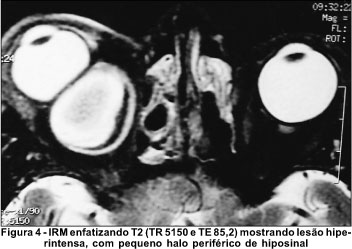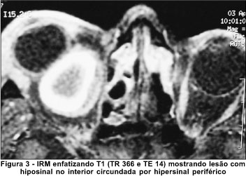 Esta características são distintas dos achados à IRM obtidos nas outras lesões císticas acima mencionadas, com as quais o cisto hemático faz diagnóstico diferencial. Isto ocorre uma vez que o cisto hemático usualmente apresenta hemorragias em diferentes fases, uma vez que é comum o resangramento dentro da lesão. Hemorragias agudas demonstram sinal intermediário em T1 e muito diminuído em T2, como pode ser observado na periferia da lesão em nosso paciente (Figuras 3 e 4). Hemorragias na fase subaguda mostram hipersinal periférico tanto em T1 como em T2 devido ao acúmulo periférico de metahemoglobina (Figuras 3 e 4). Na fase crônica, todo o hematoma mostra sinal de alta intensidade(9-10). Nosso paciente apresentava, portanto, hematoma com características agudas (na periferia) e subagudas (na sua maior parte). Tais achados são muito distintos de outras lesões tumorais acima mencionadas, incluindo o cisto hidático da órbita, que geralmente mostram sinal baixo em T1 e alto em T2 e com as quais o cisto hemático faz diagnóstico diferencial(9,11).