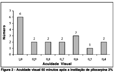 Após 1 hora da instilação do miótico, a acuidade visual variou entre 0,4 e 1,0. Após a instilação de pilocarpina 2%, houve piora da acuidade visual em 12 voluntários (66,7%), com os demais (33,3%) permanecendo com a visão de 1,0 (Figura 2). A média de piora da visão foi de 2,27 ± 2,16 linhas.
