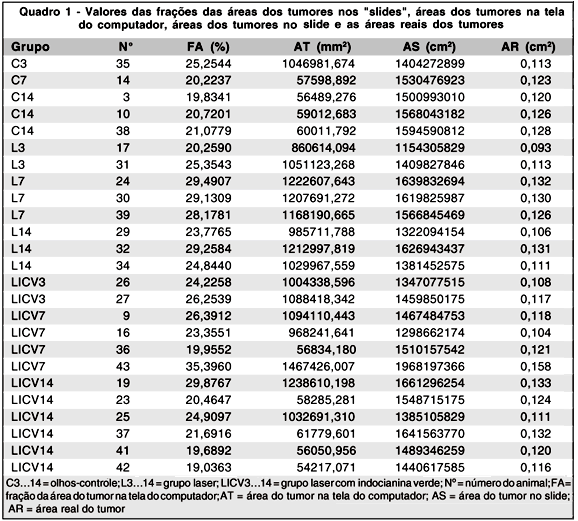 No Quadro 1 estão os valores obtidos da fração das áreas dos tumores na tela do computador, áreas correspondentes aos tumores na tela do computador, áreas dos tumores no "slide" e áreas reais dos tumores. As áreas dos tumores no "slide", em olhos dos animais de números 35, 17, 31, 24, 30, 39, 29, 32, 34, 26, 27, 9, 16, 43, 19 e 25, foram determinadas pela razão entre a área na tela do computador e o quadrado do coeficiente de magnificação que para este conjunto de olhos foi de 863,4631 mm/cm. As áreas dos tumores no "slide", em olhos dos animais de números 14, 3, 10, 38, 36, 23, 37, 41 e 42, foram determinadas pela razão entre a área na tela do computador e o quadrado do coeficiente de magnificação que para este conjunto de olhos foi de 193,9964 mm/cm.