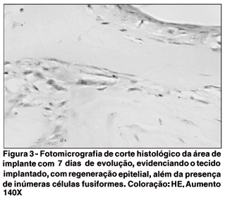 Os achados histológicos demostraram infiltrado inflamatório discreto de polimorfonucleares neutrófilos no estroma subjacente à membrana fetal, aos 2 dias. Aos 7 dias, o tecido implantado encontrava-se perfeitamente integrado ao tecido autóctone, com sua epitelização em toda extensão, com epitélio plano estratificado; notou-se proliferação de fibroblastos sobre o substrato (membrana fetal) (Figura 3) e, na periferia do implante, resposta celular e vascular mais intensas. Aos 15 dias, verificou-se aumento dos elementos matriciais amorfos, com diminuição dos vasos neoformados. Fato relevante diz respeito à ausência quase total de infiltrado inflamatório. Essas mesmas observações são válidas aos pontos de sutura, onde não se observou, em nenhuma oportunidade, resposta indesejável como formação de granuloma tipo corpo estranho. Aos 60 dias, observou-se epitelização completa da área do implante, com formação de epitélio pavimentoso estratificado e, na região subjacente, a presença de colágeno modelado com pouca celularidade (Figura 4).