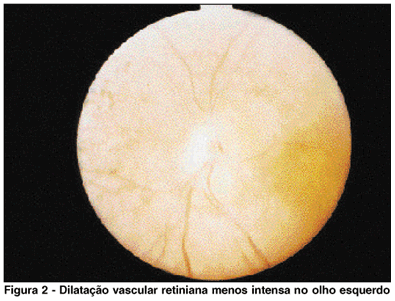 Após tratamento das anomalias vasculares periféricas com laser de argônio em ambos os olhos, a paciente retornou somente após três anos quando se verificou a persistência do descolamento de retina do olho direito, assim como das anomalias vasculares, e notou-se ainda, neovasos epirretinianos na região periférica da retina descolada, com pequena hemorragia vítrea localizada nessa região. O olho esquerdo apresentava aspecto inalterado em relação ao exame anterior. A acuidade visual havia diminuído para 20/200 em virtude de progressão das opacidades cristalinianas em ambos os olhos. Após esta data a paciente não mais retornou.