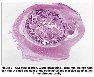 OD Macroscopy - globe measuring 14x14 mm (horiz. x vertical) and 15 mm (axial); cornea with 9x7 mm, a small segment of the optic nerve was left on the piece. Massive calcified substance filling the vitreous cavity ( Figure 3).